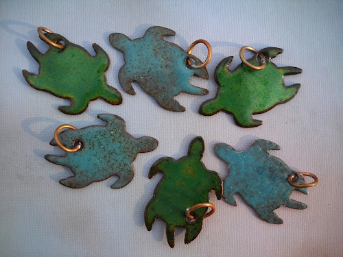 On our recent trip to Tybee, I restocked my pendants there, and even sent down some of my new enameled sea turtles last week. I also got a request from them for a little information on how these are created. So, below, I am going to put step by step photos of the creation of a FusieDoozie Sea Turtle named Tybrisa.