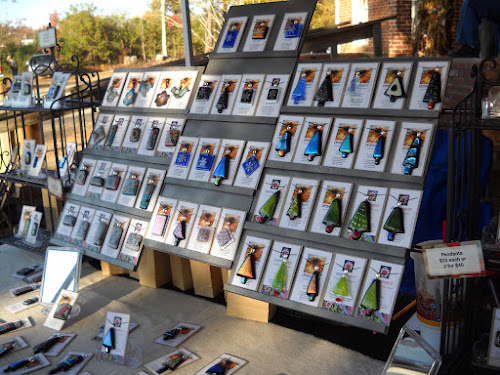 I cut and glued thin strips of foam core to create shelves for the pendants. Because of the angle of the panels, the pendant sit on the shelves without falling over or off. It is also easier now for people to see the pendants and pick them up and put them back. In the first draft of this display, the pendants were attached using s-hooks, but it was awkward for customers. They had trouble putting the pendants back on after looking at them.